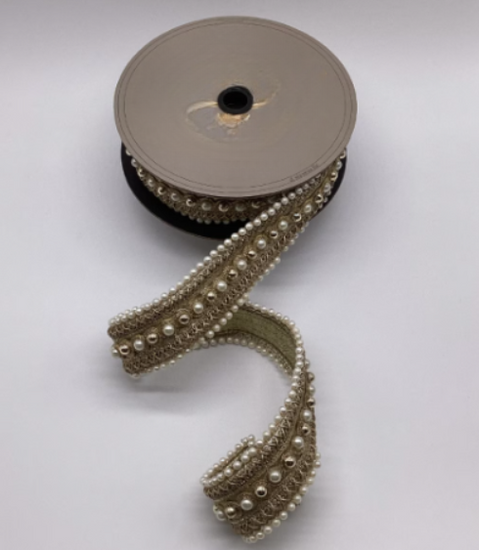 LISTON CON PERLAS DORADAS METALICAS Y JOYAS DE 1.75" X 5 YARDAS